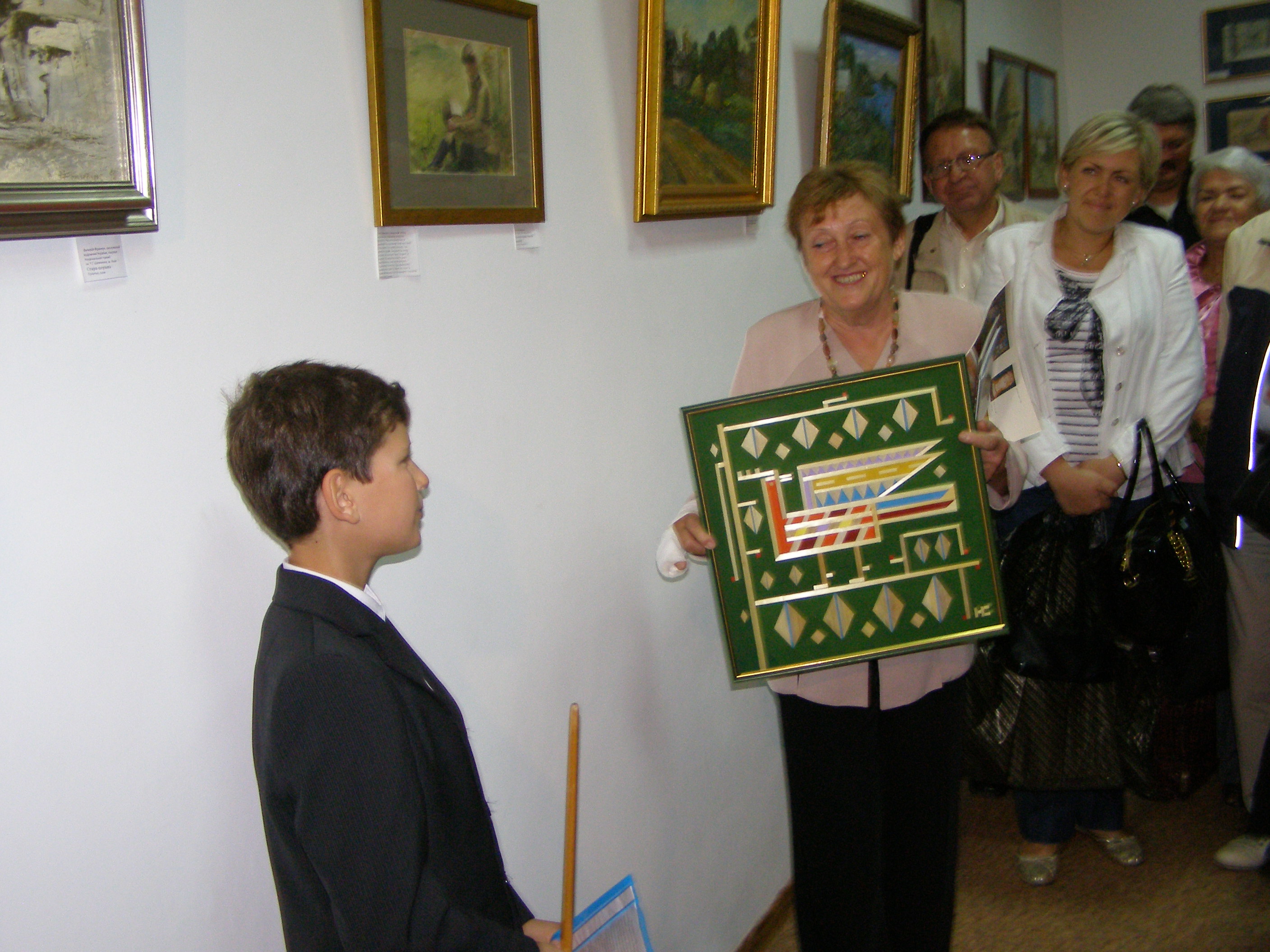 Літературно паломництво в Піски ( художниця України Ніна Саєнко дарує шкільному музею-галереї свою роботу - інкрустацію соломкою.JPG)